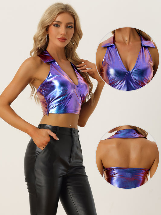 Women's Metallic Crop Top Clubwear Party Halter Rave Chrome Shirt Halter Neck Holographic Top