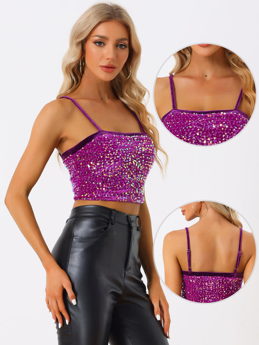 Women's Velvet Spaghetti Strap Club Party Crop Tank Sequined Cami Top