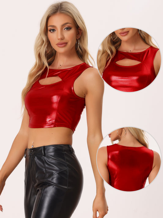 Women's Sleeveless Cut Out Party Clubwear Holographic Tank Metallic Crop Top