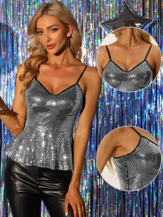 Women's Sequin Sparkle Tank Top V Neck Ruffle Camisole Sleeveless Peplum Top