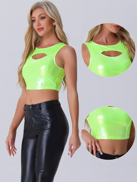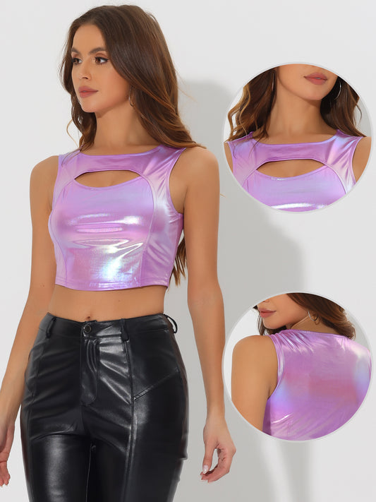 Women's Sleeveless Cut Out Party Clubwear Holographic Tank Metallic Crop Top