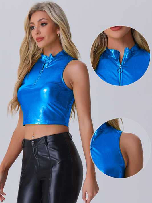 Women's Metallic Crop Top Mock Neck Zip Up Sleeveless Shiny Holographic Tank Top