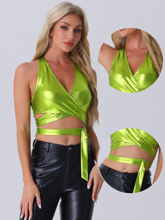 Women's Metallic Halter Neck Top Deep V Neck Backless Holographic Crop Top Clubwear