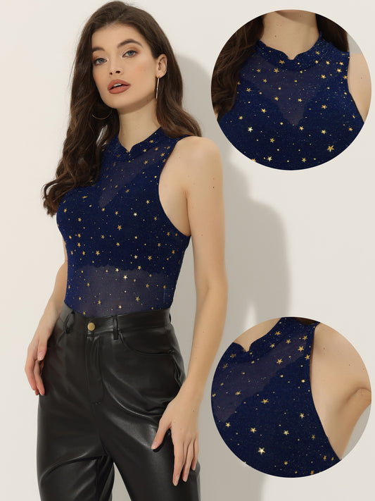 Women's Star Mesh Crop Top Metallic Mock Neck Sleeveless See Through Party Tank Top