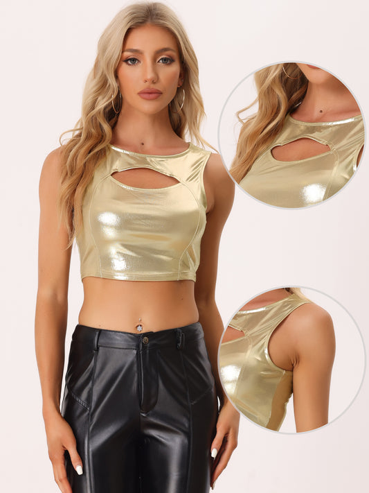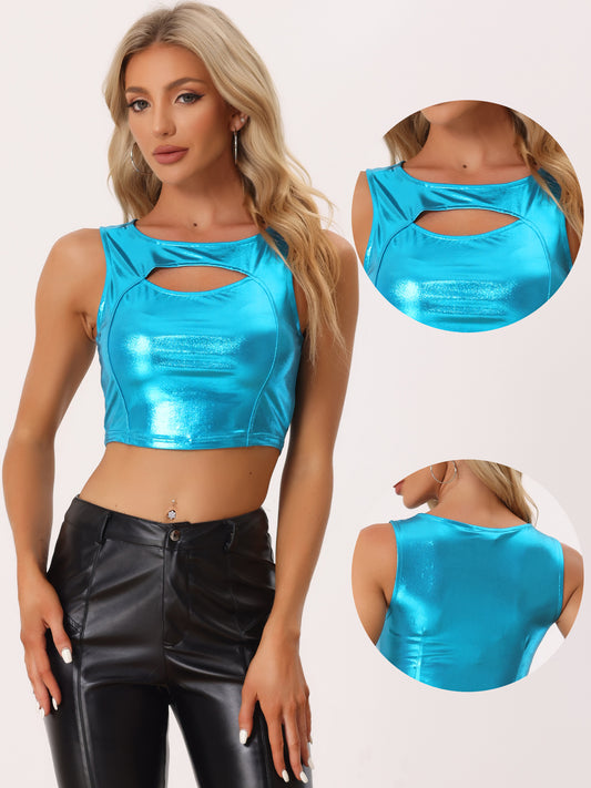 Women's Sleeveless Cut Out Party Clubwear Holographic Tank Metallic Crop Top