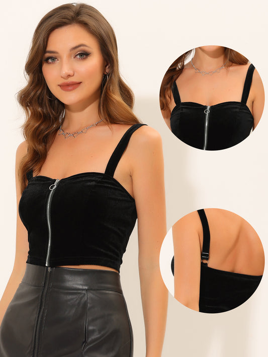 Women's Sleeveless Spaghetti Strap Zip Up Slim Fit Party Glam Velvet Cami Tank Crop Top