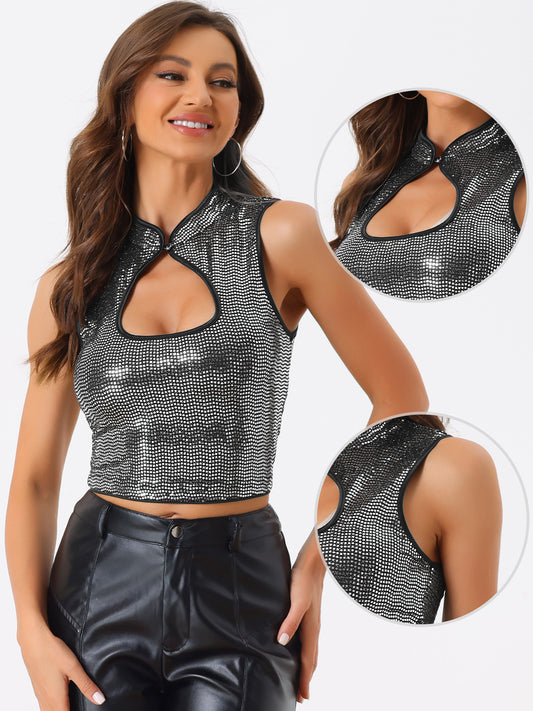 Women's Sleeveless Cut Out Front Crop Tank Top Slim Fitted Sequins Top