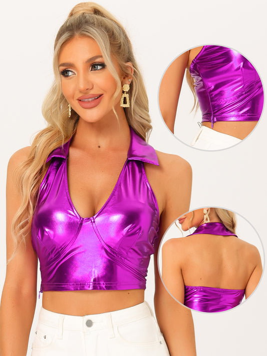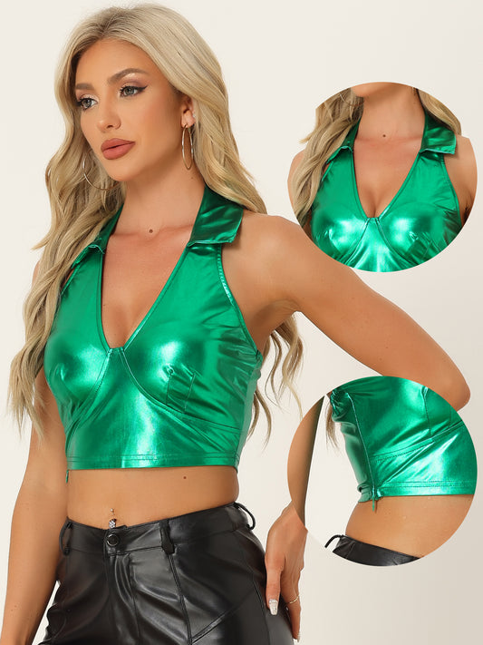Women's Metallic Crop Top Clubwear Party Halter Rave Chrome Shirt Halter Neck Holographic Top
