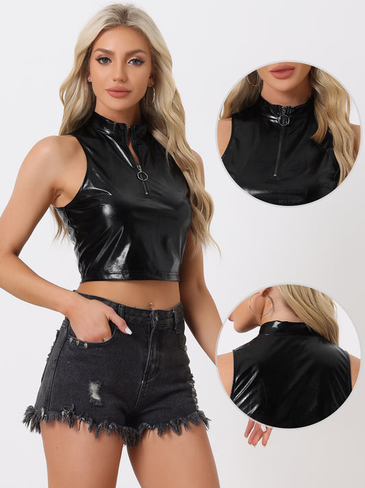 Women's Metallic Crop Top Mock Neck Zip Up Sleeveless Shiny Holographic Tank Top