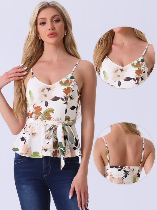Women's Tank Top V Neck Tie Waist Peplum Floral Sleeveless Cami