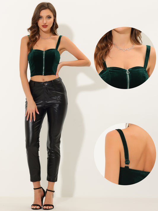 Women's Sleeveless Spaghetti Strap Zip Up Slim Fit Party Glam Velvet Cami Tank Crop Top