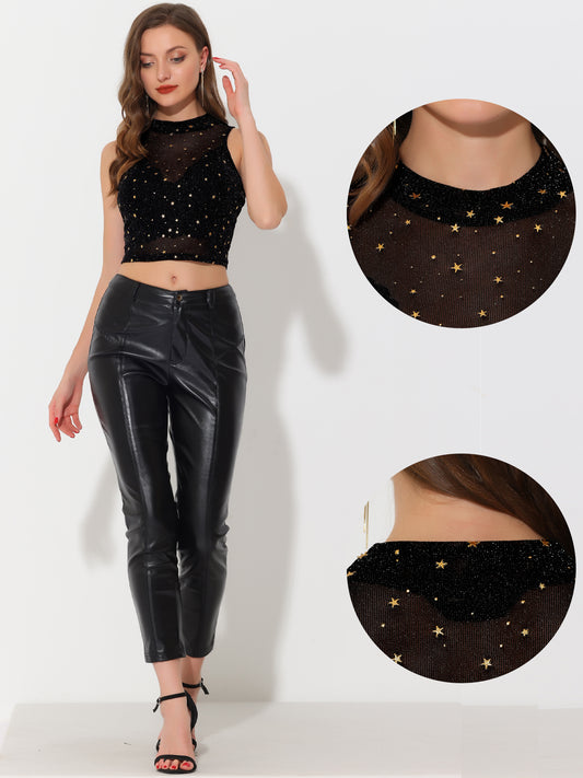 Women's Star Mesh Crop Top Metallic Mock Neck Sleeveless See Through Party Tank Top