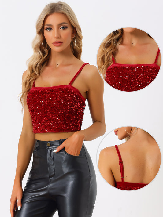Women's Velvet Spaghetti Strap Club Party Crop Tank Sequined Cami Top