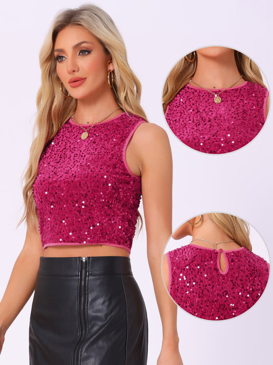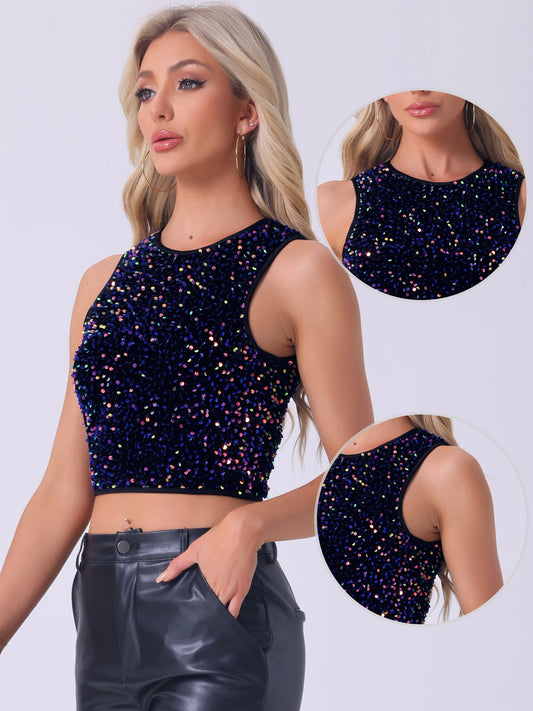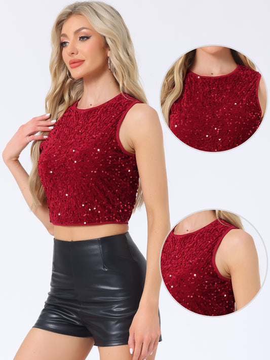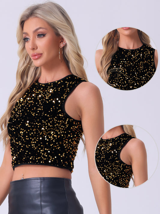 Women's Sparkle Glitter Sequin Top Crew Neck Sleeveless Club Party Nightout Crop Tank Top