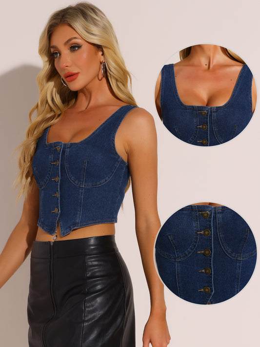 Women's Sleeveless Square Neck Button Down Jean Waistcoat Vest Denim Top