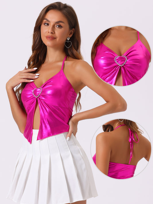 Women's Metallic Backless Cami Asymmetrical Spaghetti Straps Halter Sparkle Top