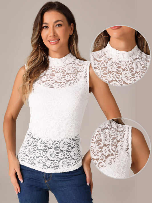 Women's Floral Lace Tank Mock Neck Sleeveless See Through Tank Top