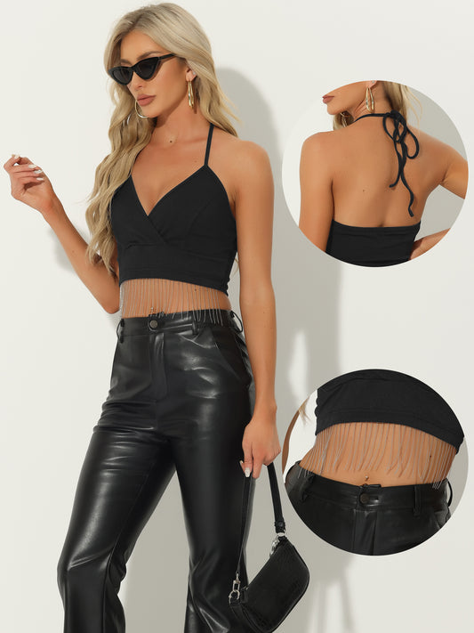 Women's Rhinestone Fringe Crop Tops Sleeveless Tie Halter Neck Party Cropped Cami Tops