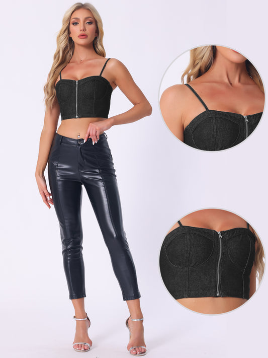 Women's Denim Bustier Crop Top Zip Up Adjustable Straps Jean Corset Top