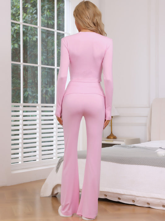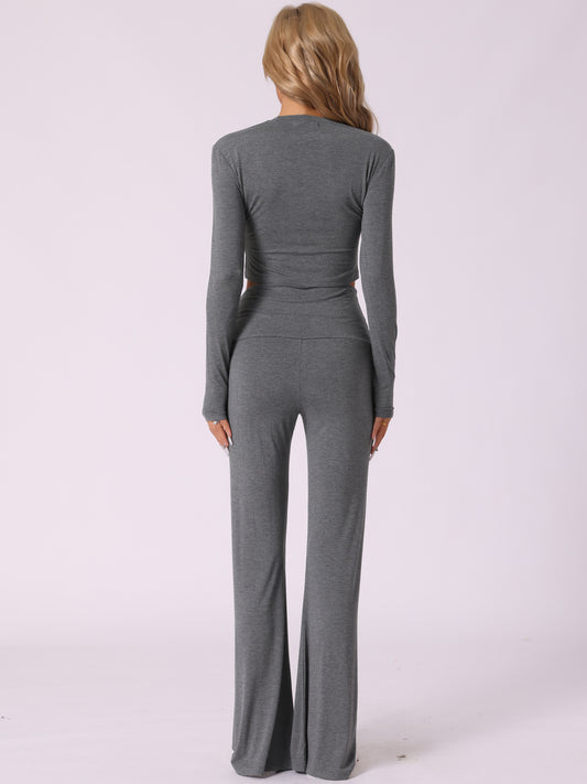 Ensemble 2 pièces pour femme, haut court à manches longues, pantalon évasé à rabat, pyjama décontracté