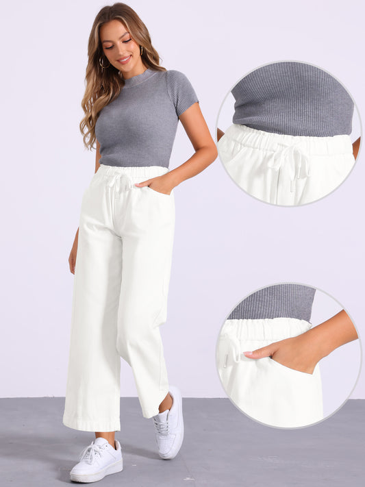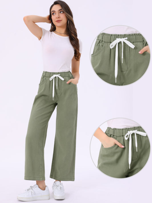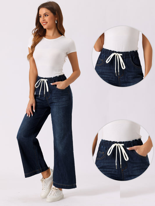 Women's Casual Denim Pants Baggy Drawstring Elastic Waist Wide Legs Jeans
