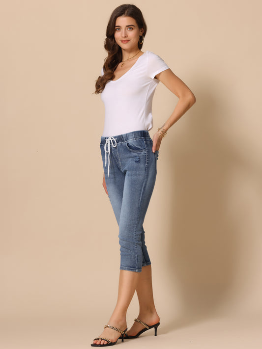 Women's Denim Capri Pants Distressed Drawstring Elastic Waist Skinny Jeans