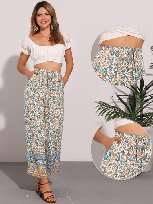 Women's Boho Floral Pants Drawstring Waist Beach Wide Leg Pants with Pockets
