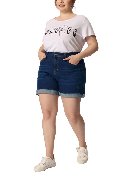 Women Plus Size Denim Shorts Roll Hem Mid Rise Stretch Short Pants