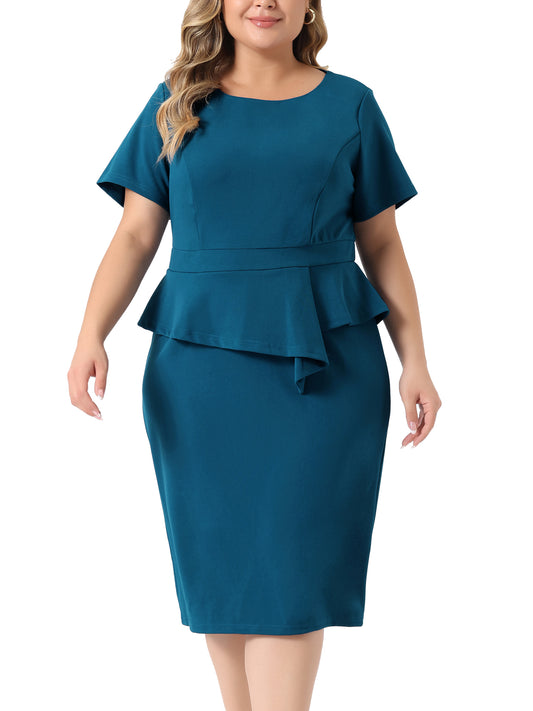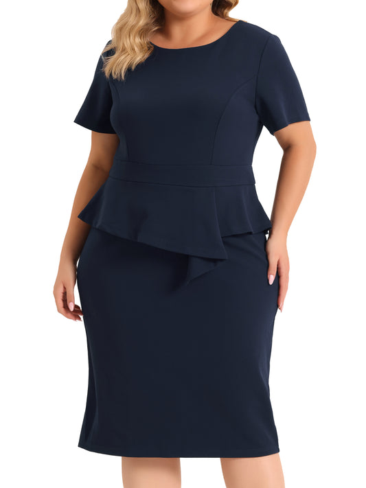 Women Plus Size Business Dresses Short Sleeves Crew Neck Work Office Peplum Pencil Dress