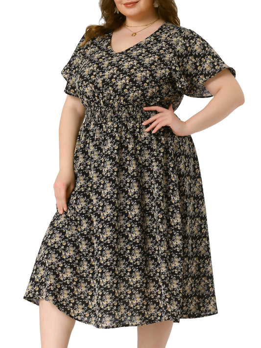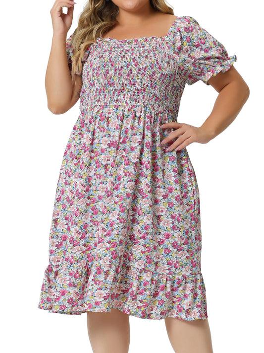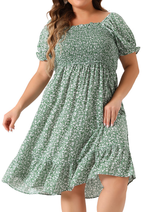 Women Plus Size Dress Ruffle Short Sleeve Flared Flowy Smock Floral Print Dress