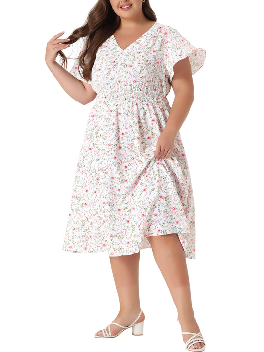 Women's Plus Size Summer Dress Floral Print V Neck Smocked A-Line Flowy Midi Dress