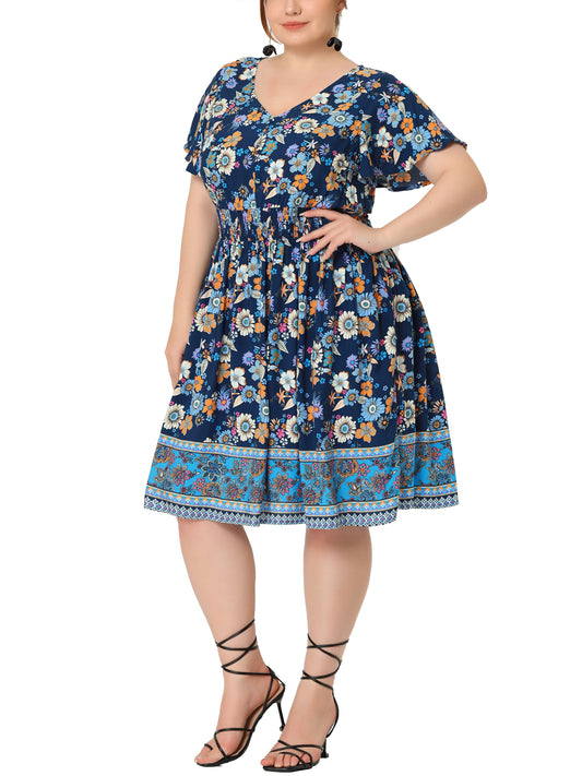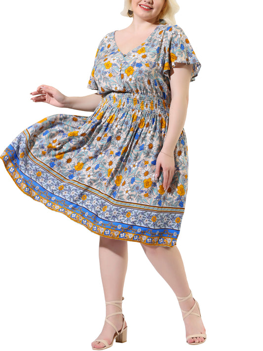 Women Plus Size Placed Pattern Bohemian Smock Waist V Neck Summer Midi Dress