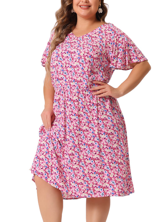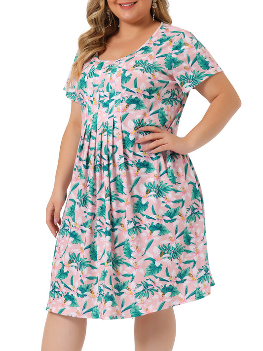 Women Plus Size Short Sleeves Pleated Summer Casual Loose Floral Dress