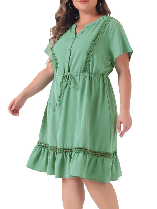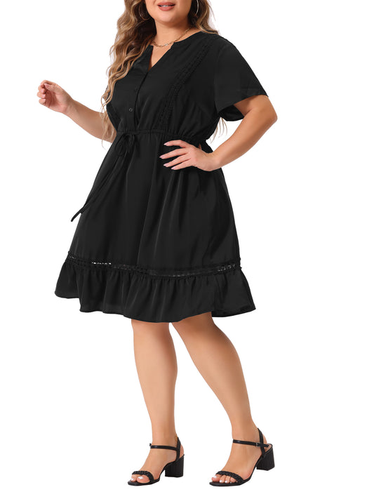 Women Plus Size Button V Neck Summer Midi Ruffle A Line Swing Dress