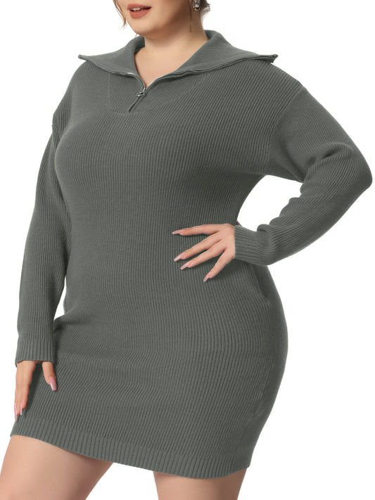 Women's Plus Size Casual Zip Up Long Sleeve Knit Sweater Dress Foldover Collar Loose Pullover Jumper Sweater