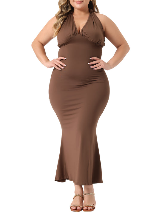 Women Plus Size Maxi Dress Halter V Neck Backless Cocktail Party Mermaid Evening Dress