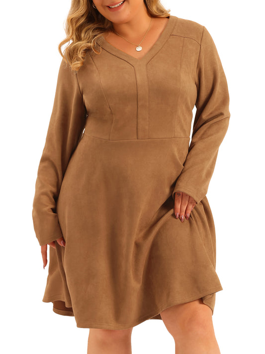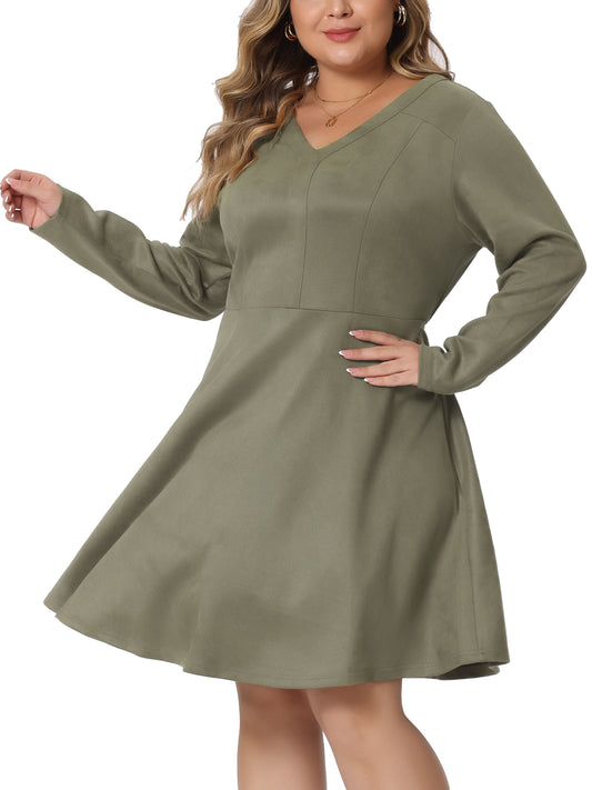 Women Plus Size Faux Suede Dress V Neck Long Sleeve A-Line Elegant Midi Dress