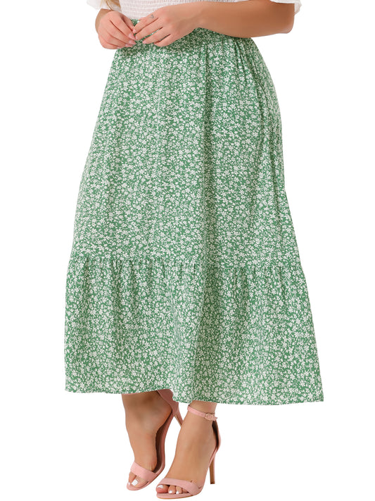 Women Plus Size Skirts Floral Flowy Stretchy Waist Layered A Line with Pocket Summer Maxi Skirt
