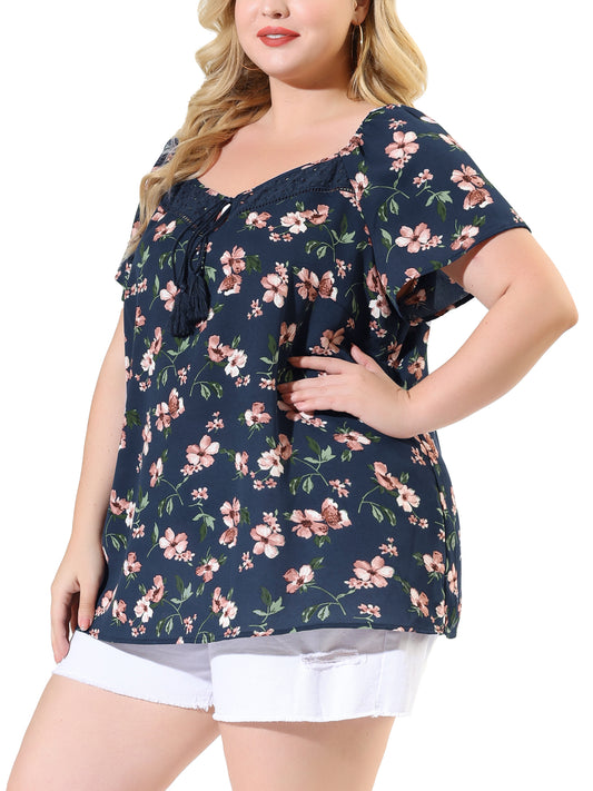 Women Plus Size Flared Sleeve Floral Summer Lace Panel Tunic Blouse