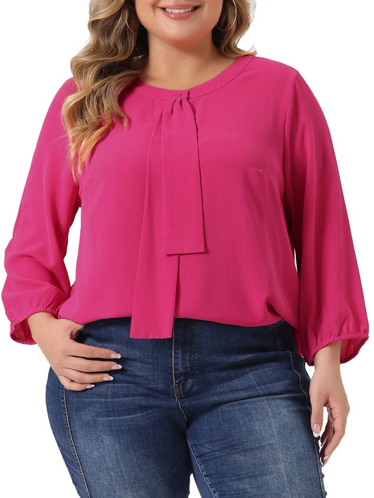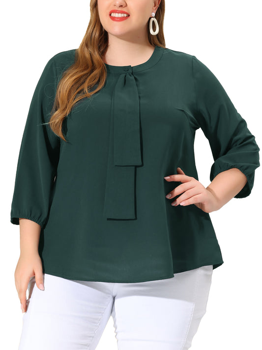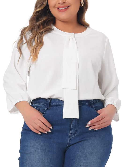 Women Plus Size Top 3/4 Sleeve Work Office Tie Front Ruffle Chiffon Blouse