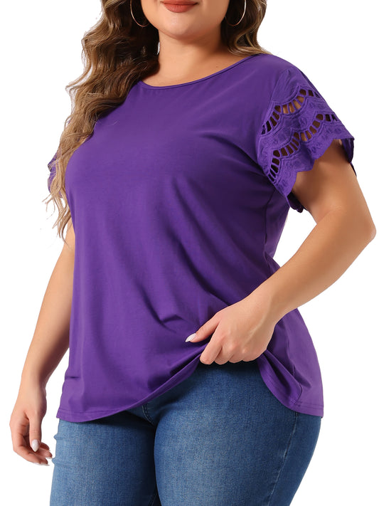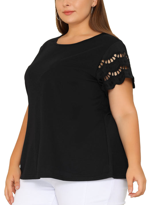 Women's Plus Size Top Round Neck Lace Panel Hollow Short Sleeve Elegant Summer Blouse