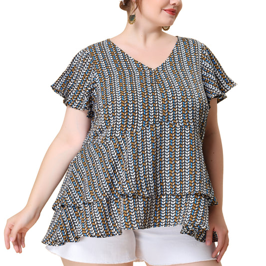 Women's Plus Size Summer Top V Neck Short Sleeve Peplum Geometric Print Layered Ruffle Blouse