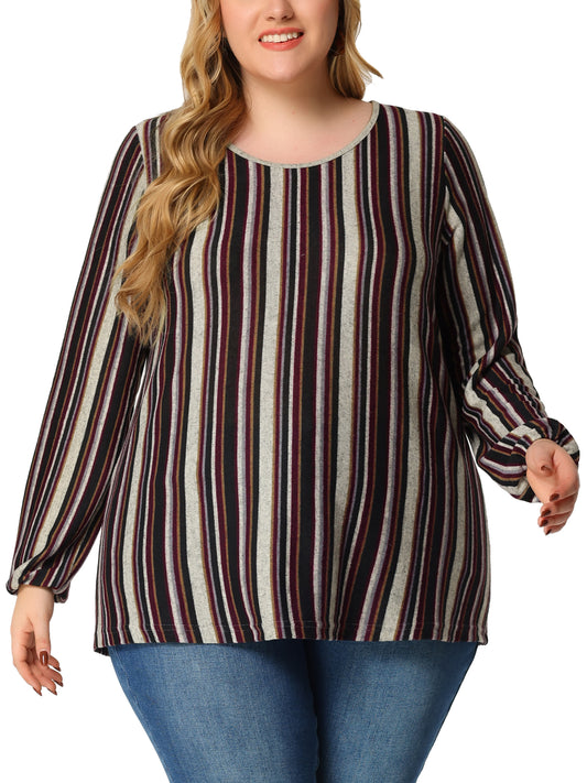 Women Plus Size Boho Color Block Elastic Cuff Long Sleeve Striped Top