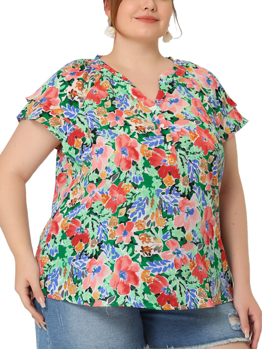 Women's Plus Size Top Floral Printed Ruffle Trim V Neck Layered Sleeve Blouse
