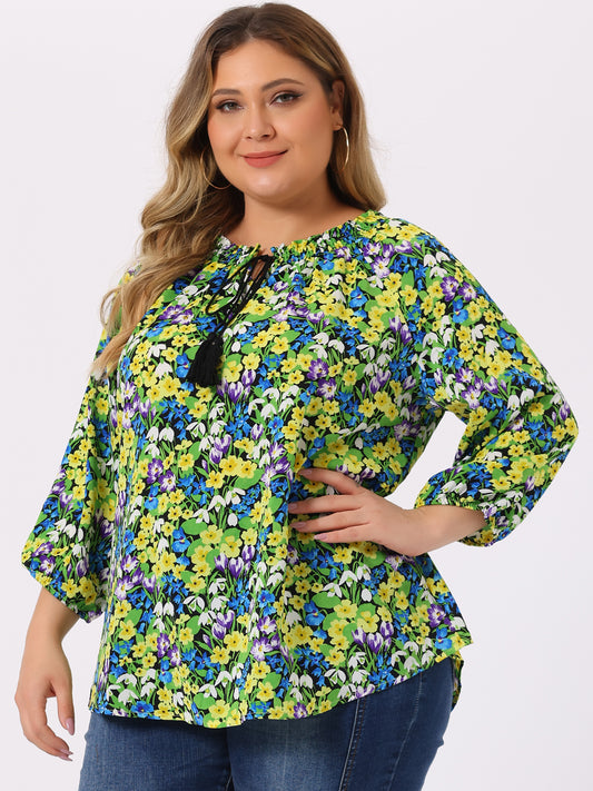 Women's Casual Plus Size Boho Floral Loose Tops Tie 3/4 Sleeve Beach Tunic Blouse