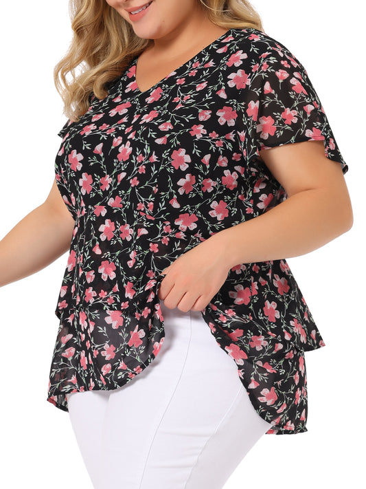 Women's Plus Size Top Floral Printed Ruffle Trim V Neck Layered Sleeve Blouse