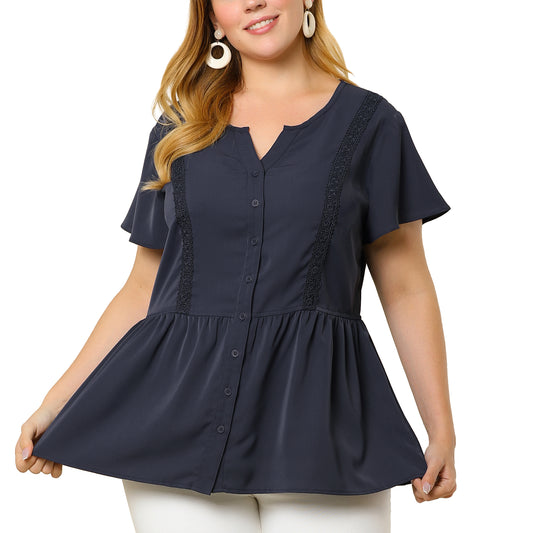 Women Plus Size Blouse Shirt Button Down V Neck Short Sleeve Flare Peplum Top