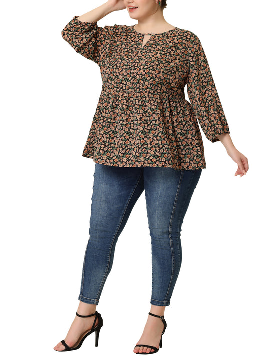 Women's Plus Size 3/4 Sleeves Babydoll Chiffon Keyhole Floral Flowy Blouse