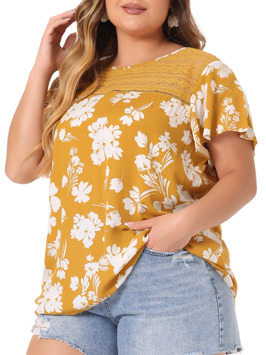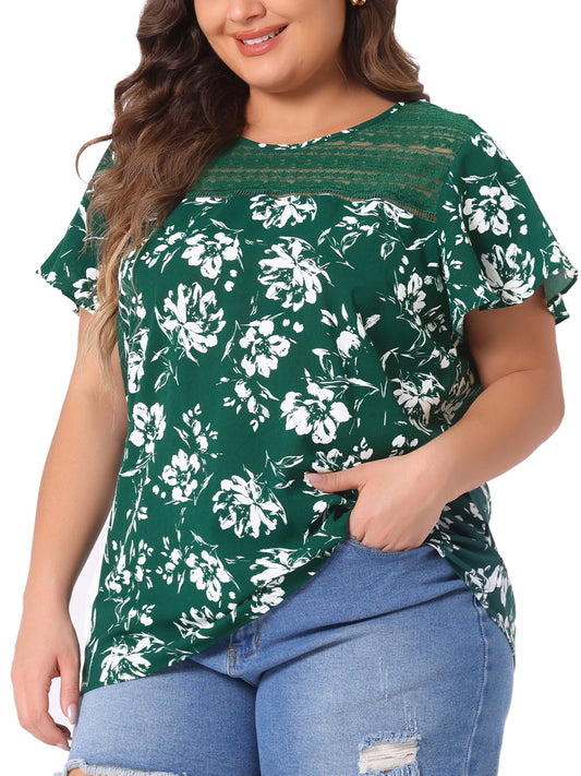 Women Plus Size Flared Sleeve Floral Summer Lace Panel Tunic Blouse