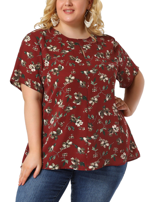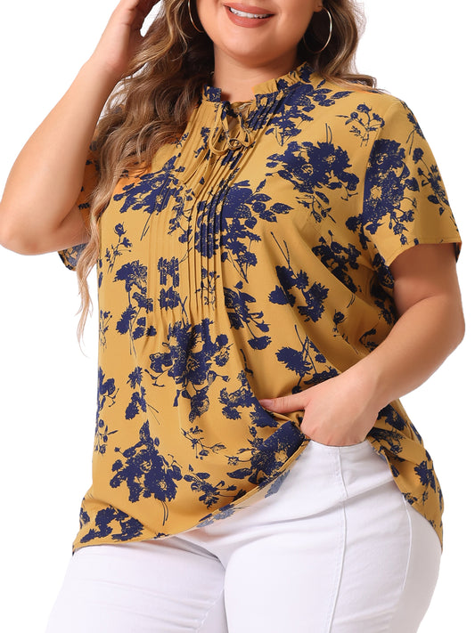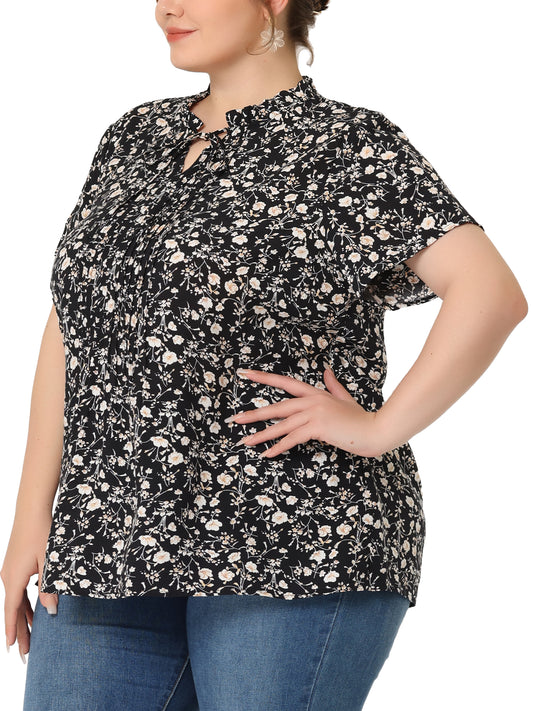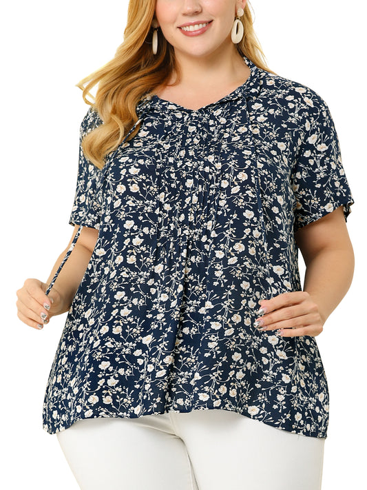 Women Plus Size Tie Neck Short Sleeve Pleated Floral Summer Blouse